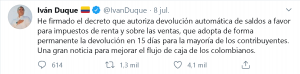 El presidente Duque celebró la firma de este decreto vía Twitter: