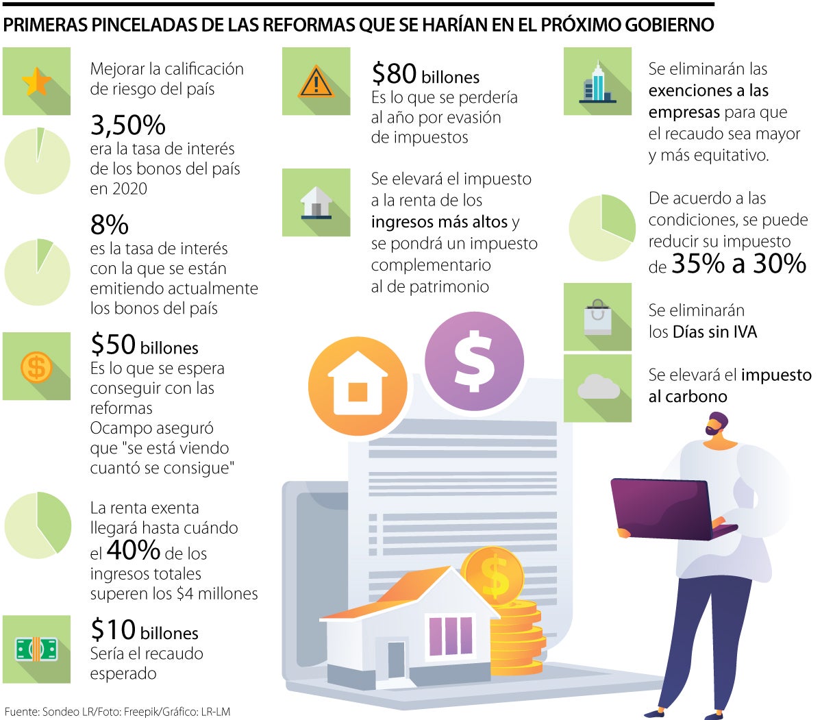 En charla con el diario británico Financial Times, Ocampo también afirmó que las reformas al recaudo que se impulsen en el nuevo gobierno le apuntarán a las personas con más ingresos y no a las empresas. De hecho, dijo que en caso de que las condiciones lo permitieran, buscarían bajar la carga fiscal de las empresas, de 35% hasta 30%, afirmó.