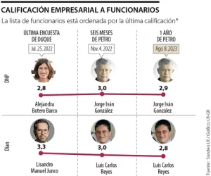 Como se mencionó, en el segundo lugar de esta encuesta empresarial quedó el director de la Dian, Luis Carlos Reyes, con una calificación que también bajó, pues pasó de 3,0 en noviembre del año pasado a 2,8 en el último ranqueo. Su gestión se ha caracterizado por un enfoque de entendimiento para el ciudadano, lo cual resaltan los analistas políticos.