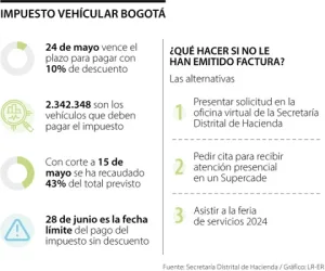 La Secretaría de Hacienda de Bogotá les recordó a los contribuyentes que el 24 de mayo se vence el plazo para pagar el impuesto vehicular, con 10% de descuento por pronto pago. Con corte a 15 de mayo el distrito ya recaudó $551.463 millones, que representa 43% de la meta proyectada.