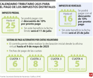 En cuanto al impuesto predial, los ciudadanos tendrán hasta el 25 de abril para pagar con el descuento de 10% por pronto pago. Sin este beneficio, la fecha límite será el 11 de julio. La Secretaría de Hacienda aclaró que quienes lo requieran pueden acogerse al Sistema de Pago Alternativo por Cuotas Voluntario (Spac), que permite diferir el pago de la obligación en cuatro cuotas iguales a lo largo del año, sin intereses.