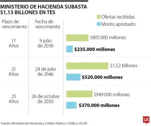 Sobre la subasta de los títulos de deuda pública, la cartera de Hacienda que, para aquellos con vencimiento en 11 años se recibieron ofertas por $805.000 millones y tuvieron un monto aprobado de $235.000 millones; los de vencimiento en 21 años tuvieron ofertas por $1,52 billones y un monto aprobado por $520.000 millones y los que se vencen en 26 años recibieron ofertas por $949.000 millones y un monto aprobado por $370.000 millones.