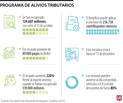 La Secretaría de Hacienda de Bogotá comunicó que se han recuperado $124.607 millones en el marco del programa Alivios Tributarios y el saldo recaudado creció 220% frente al monto reportado anteriormente, que ascendió a $39.000 millones. [...]